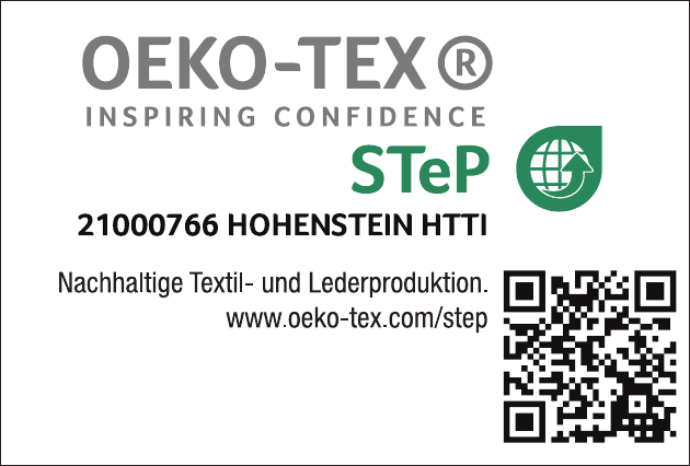 STeP ÖkoTex Mit der erfolgreichen Zertifizierung konnten wir die durchgängige Einhaltung der hohen Standards belegen. Wir sehen dies als Herausforderung uns weiter zu verbessern. Wir sind uns unserer Verantwortung gegenüber Ihnen als unsere Kunden, unserem Team, den weiteren Geschäftspartnern und der Gesellschaft bewusst und werden auch weiterhin mit innovativen Lösungen in die Zukunft gehen. ![]()